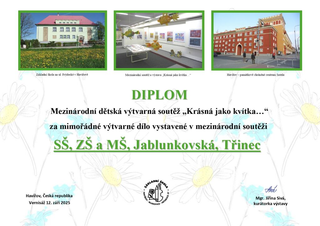 Naše škola se úspěšně zúčastnila mezinárodní výtvarné soutěže „Krásná jako kvítka …“, ve které byla vybrána mezi nejlepší účastníky. Porota ocenila výtvarná díla našich žáků a zařadila je do závěrečné výstavy nejlepších prací. Za tento úspěch jsme obdrželi diplom pro úspěšné školy.